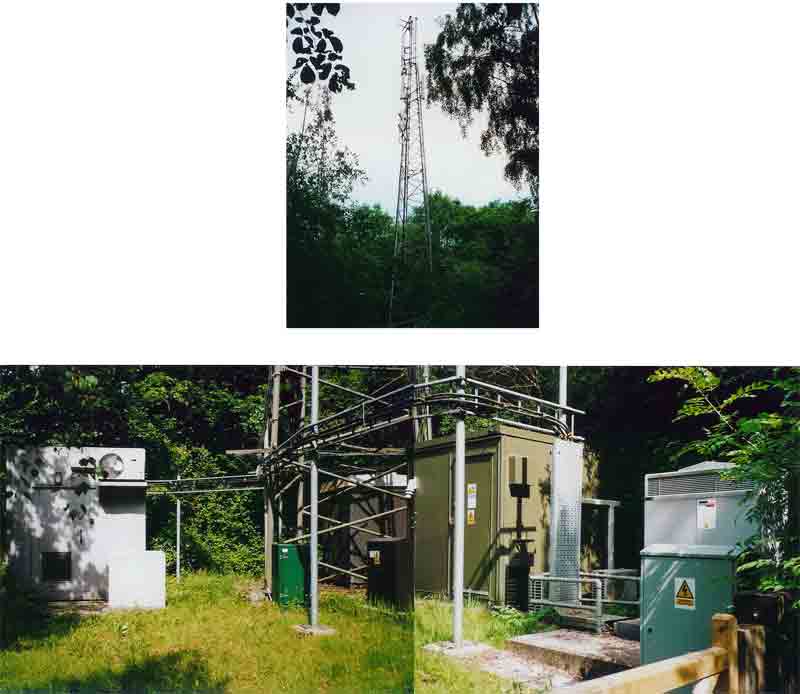 tapering then parallel lattice mast; 3 tetra ant; pale grey equipment cabin;