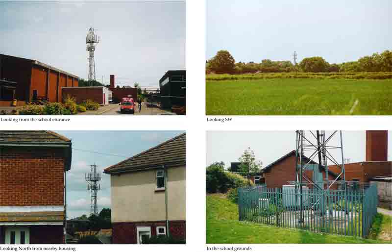 tall intrusive mast with a confusion of antennae, sited in school grounds